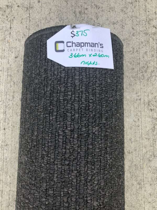 https://facebook.com/chapmanscarpetbinding ATIGNIS – NIGHT OWL – Colour Number 1-02. Dark Charcoal coloured Ribbed Berber Loop Pile Carpet. Fibre 100% BCF Classion Olefin (UV Stabilized). Colouration: 100% Solution dyed. Width 3.66 metres. Rating: Residential Heavy Duty. Abrasive Wear, Colour Fast, Anti- Shock. We Specialise in making LARGE and TO SIZE Carpet Rugs, Runners and Circles from our off the roll carpet we supply. Contact Jane with your sizes for a free quotation today.